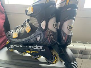 Patines en línea con cuatro ruedas, ideales para deslizarse. Una vez usado. - Diseño en color negro y detalles en amarillo. - Cierre con cordones y correa superior. - Interior con tejido CoolMax.