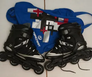 Se venden patines en línea de la marca TOPICNOISY , poco usados Rejillas frontales para refrigeración del pie Ruedas en perfecto estado y rodando perfectamente Se entrega los dos patines Protecciones de codo , rodilla y manos Bolsa transporte de la marca TOPICNOISY TALLA DE LOS PATINES 40