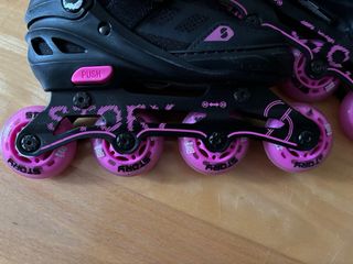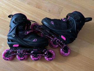 Se venden patines en línea en color negro con detalles en rosa. - Cierre con cordones. - Ruedas de patinaje.talla 29 32