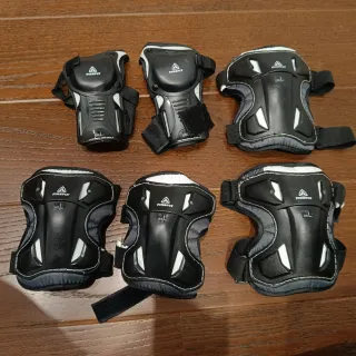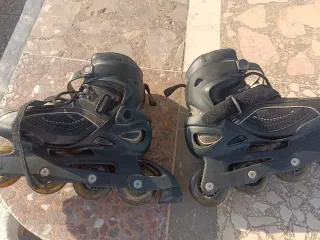 Set de patines en línea negros, listos para la acción. Incluye protecciones para mayor seguridad. Usados una vez - Patines de color negro. - Cierre con cordones y correas. - Incluye rodilleras y coderas