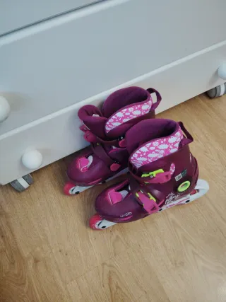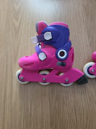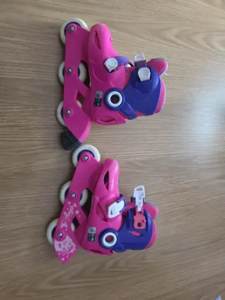 Patines en línea ajustables para niña, ideales para iniciarse en el patinaje. - Tallas ajustables: 30, 31 y 32. - Color rosa y morado. - Cierre con velcro y hebilla. - Ruedas de poliuretano.