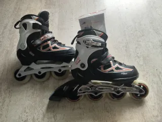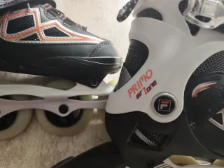 Patines en línea Fila modelo Primo Air Zone. - Diseño en color negro, blanco y naranja. - Cierre con velcro y hebilla. - Ruedas de poliuretano. - Precio negociable. - Talla: 36
