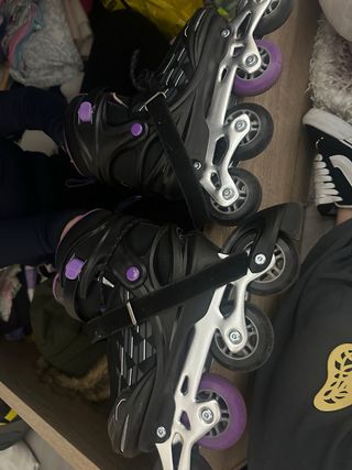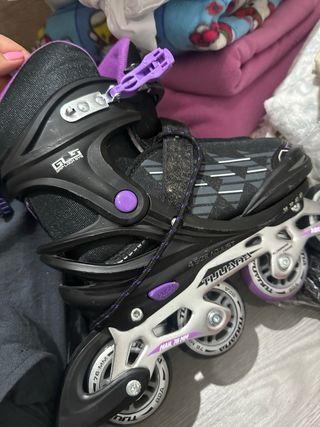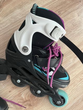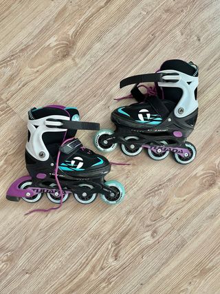 Patines en línea ajustables para tallas de la 33 a la 37. - Diseño en negro, blanco y morado. - Cierre con velcro y cordones. Poco uso.