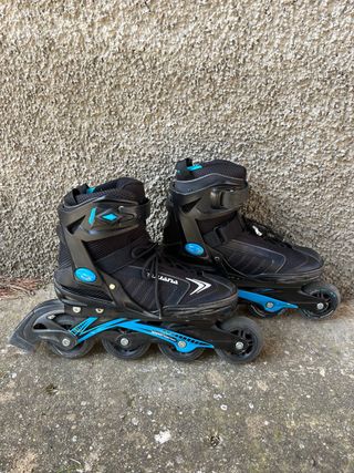 Se venden patines en línea de la marca Racerline XT. - Color azul y negro. - Cierre de velcro y cordones. - Ruedas Boomerang. - Talla 39-40