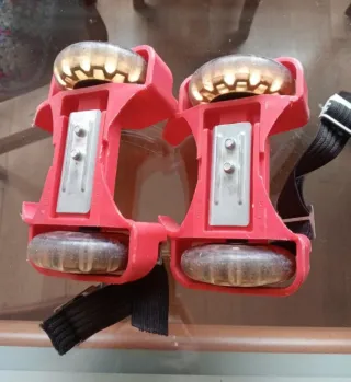 Par de patines rojos con ruedas. - Cierre con correa. - Ruedas transparentes de goma. Para poner con zapatillas. Ajustables Tienen algún desgaste por el uso