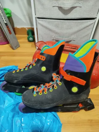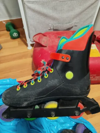 Patines en línea con un diseño llamativo y colorido. Talla 40-42 - Cordones naranjas y turquesas. - Detalles en naranja, morado y verde lima. - Ruedas moradas y verdes.