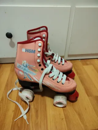 Patines de estilo retro en color rosa, con detalles en rojo y cordones blancos. N33 - Diseño con estampado Broadway y HSM. - Ruedas blancas con inscripción CHAD. - Cierre con cordones.