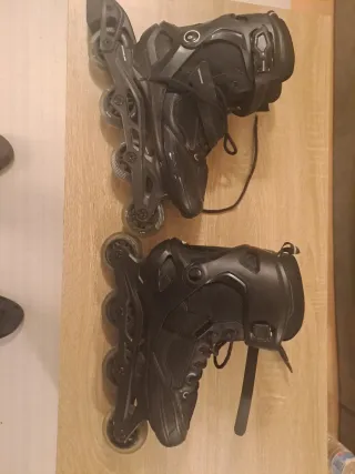 Par de patines en línea de color negro. - Diseño deportivo. - Cierre con cordones. - Ruedas de poliuretano. Talla 45