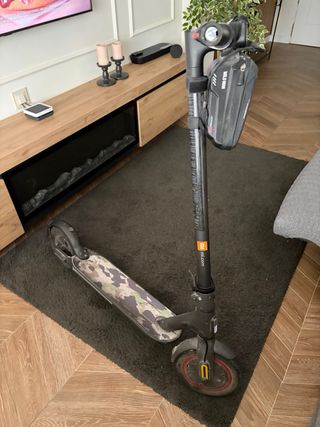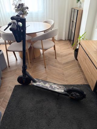 Patín eléctrico XIAOMI con un diseño de camuflaje en la base. - Base con estampado de camuflaje. - Ruedas negras. - Manillar negro.