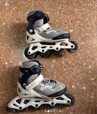 Patines en línea para niña, talla 32 a 35. - Diseño en color gris y blanco. - Cierre de velcro y hebilla. - Ruedas de 70mm.