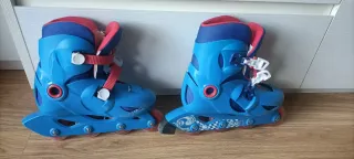 Patines en línea de color azul y rojo, ideales para niños. Son ajustables para adaptarse al crecimiento. Talla 34 - 36 - Diseño deportivo. - Cierre de velcro y hebilla. - Ruedas de poliuretano.