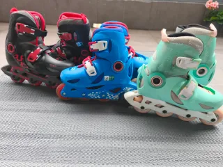 Conjunto de patines infantiles, perfectos para iniciarse en el patinaje. Son ajustables para adaptarse al crecimiento. PRECIO UNITARIO - Patines en color negro y rojo Talla 34-36 - Patines en color azul Talla 30-32 - Patines en color verde menta Talla 31-33