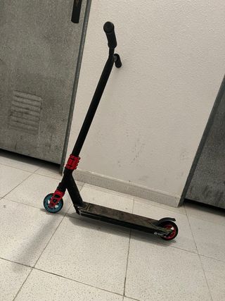 Patinete de saltos con manillar negro y detalles rojos y azules. - Ruedas de color azul y rojo. - Base negra con diseño. - Puños negros.