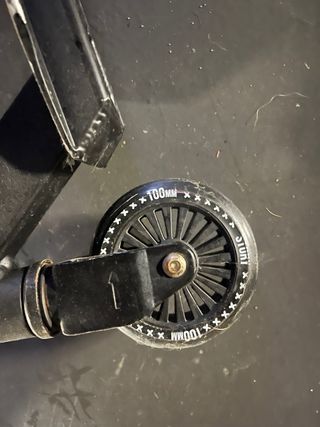 Patinete de color negro con detalles en las ruedas y manillar. - Manillar con puños de colores. - Ruedas negras con detalles. - Plataforma negra de 50cm -Manillar de 43cm de ancho y 63cm de altura Se vendo porque no se utiliza