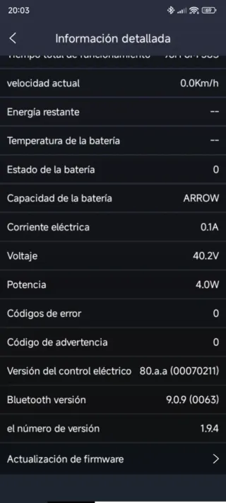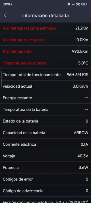 Patinete eléctrico con información detallada de su uso. - Kilometraje restante estimado: 21.2Km - Kilometraje total: 990.5Km - Temperatura del scooter: 5.0°C - Tiempo total de funcionamiento: 96H 6M 51S - Velocidad actual: 0.0Km/h - Voltaje: 40.3V - Potencia: 3.6W - Códigos de error: 0 - Código de advertencia: 0 Ruedas cambiadas por las de 10pulgadas en muy buen estado se puede ver sin ningún compromiso