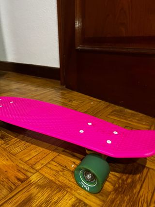 Patinete tipo Penny Board de color rosa brillante. - Tabla de plástico resistente. - Ruedas verdes. - Diseño compacto y ligero.