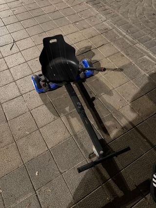 Patinete tipo hoverboard con asiento adaptable. Ideal para desplazamientos divertidos. - Asiento negro. - Ruedas azules. - Estructura metálica azul.