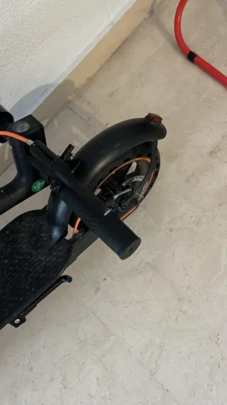Patinete eléctrico nuevo en perfecto estado, listo para usar. - Tiene menos de 1Km. - Diseño moderno en color negro con detalles naranjas. - Ruedas con llantas naranjas. - Manillar con acelerador y freno. - Hago envios.
