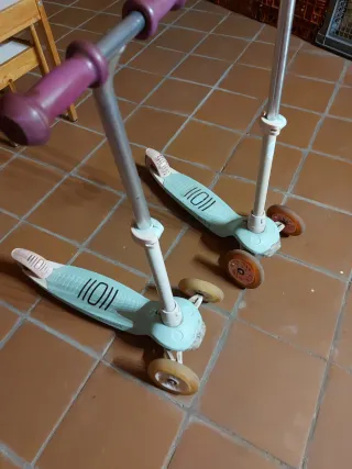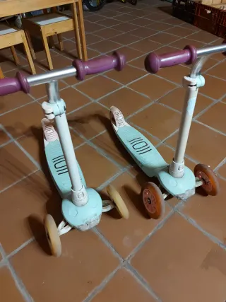 Se venden 2 patinetes de tres ruedas con manillar ajustable, se han usado 2 años, solo necesitan limpieza, las ruedas al girar tienen led de colores, no tienen nada roto, 25€ los 2uds. -