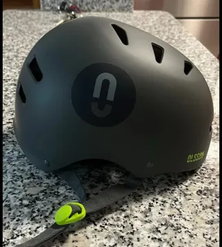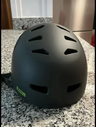 Casco protector para patinete o bicicleta. Diseño moderno y seguro. - Color negro mate. - Cierre ajustable con hebilla. - Logo circular en el lateral. - Inscripción lateral 'OLSSON'.