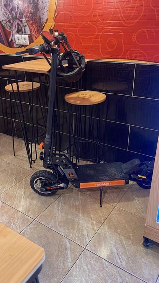 Patinete eléctrico Todimart con casco. - Color negro y naranja. - Rueda delantera de gran tamaño. - Manillar ajustable Lo he usado 2 veces tiene menos que 30km Tiene 2 motores y 3 Velocidad: 25. 35. 50 km por hora. 3 modo de conducción