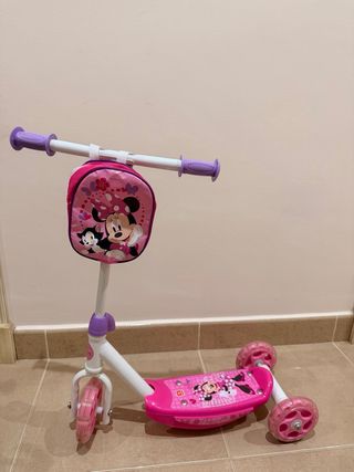 Patinete infantil de tres ruedas con diseño de Minnie Mouse. Ideal para los más pequeños. - Color rosa. - Manillar ajustable. - Bolsa frontal. - Ruedas luminosas.