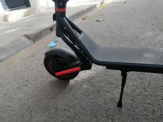 Patinete eléctrico de color negro con detalles en rojo. - Plataforma antideslizante. - Ruedas con llantas rojas. - Guardabarros trasero amarillo.