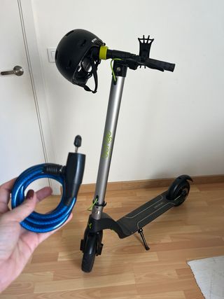 Patinete eléctrico Cecotec D20. Se entrega con casco, chaleco, cargador y factura original. - Color gris y negro. - Rueda delantera y trasera. - Manillar ajustable. - Incluye casco de protección.