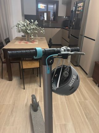 Patinete eléctrico en buen estado, listo para usar. Incluye casco. - Color grisáceo. - Manillar con puños negros y detalles en azul. - Rueda delantera visible. Precio negociable