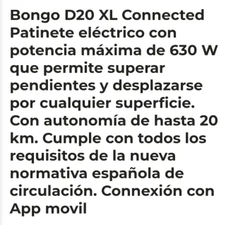 Patinete eléctrico Cecotec Bongo D20 XL Connected. - Ruedas XL - Conexión con App Móvil. - Potencia máxima 630 W. - Freno eléctrico delantero y freno de disco trasero. - Cumple los requisitos de la nueva normativa de circulación.