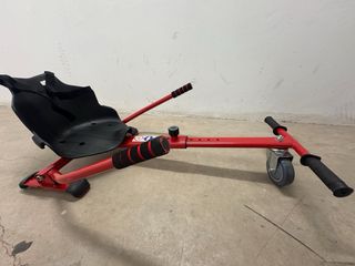 Se vende silla kart hoverboard de color rojo. Es un modelo robusto y aparentemente en buen estado. - Incluye asiento de plástico negro. - Dispone de dos manillares laterales y uno frontal. - Mecanismo de dirección en el manillar central.