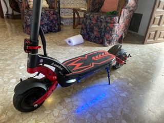 vendo el patín por falta de uso ya que no tengo tiempo para cojerlo,el patín va perfectamente no le falla nada,va todo correctamente,la rueda de atrás está recién puesta y tmb de hace dos semanas tiene puesta una centralita JP de 55Voltios nueva,el patín coje entre 55 y 60km/h dependiendo del peso o la batería,el patín arranca bastante bien fuerza no me hace falta sube las cuestas sin esfuerzo,la batería dura bastante ya que de pasar a una centralita JP no consume tanto,tiene manillar y potencia de bici en morado que qda bastante bien con los detalles que tiene, doble suspension. precio bastante bien no mareantes bajo un poco mas.