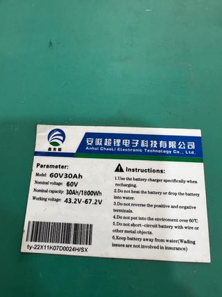 Batería para patinete eléctrico en buen estado. Está nueva. Desmontada de un patinete nuevo que no se vendió. Me quedan más piezas. - Medidas: 38x15x8 cm. - Modelo: 60V30Ah - Capacidad nominal: 30Ah/1800Wh - Voltaje de funcionamiento: 43.2V-67.2V - Incluye bornes y fusibles.