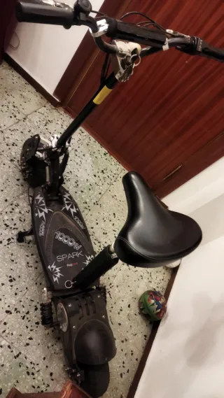 Se vende patinete eléctrico Spark de 1000W,36v Incluye asiento. - Modificado a batería de litio (hace año y medio),muy poco uso - Ruedas robustas y con los neumáticos casi nuevos (hilos de goma visibles) - Manillar ajustable y plegable .Con llave de arranque ,frenos de disco (pastillas),suspensión delantera y trasera