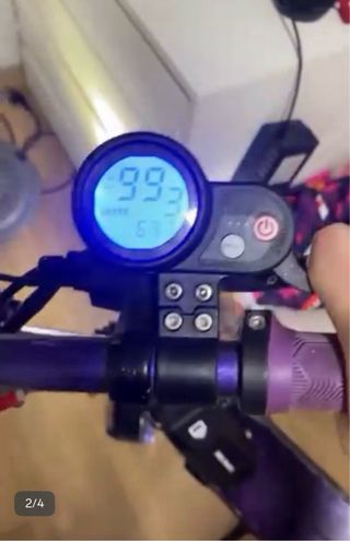 Patinete eléctrico con pantalla digital. - Pantalla muestra velocidad en km/h. - Indicador de batería. - Botón de encendido/apagado.