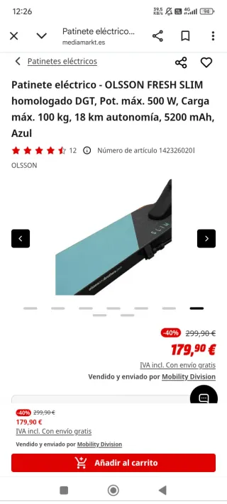 Patinete eléctrico Olsson Fresh Slim en color azul. Homologado por la DGT. - Potencia máxima: 500 W - Carga máxima: 100 kg - Autonomía: 18 km - Batería: 5200 amp