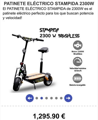 Patinete eléctrico Stampida 2300W con motor brushless y asiento. - Motor de 2300W Brushless. - Velocidad máxima de 60 km/h. - Batería recargable. - Incluye alarma.