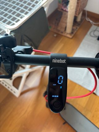 Patinete eléctrico de la marca Ninebot. Cuenta con una pantalla digital que muestra la velocidad en km/h y el nivel de batería. - Pantalla digital. - Indicador de velocidad (km/h). - Indicador de nivel de batería.