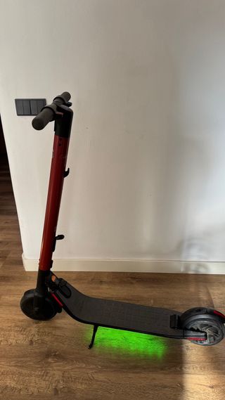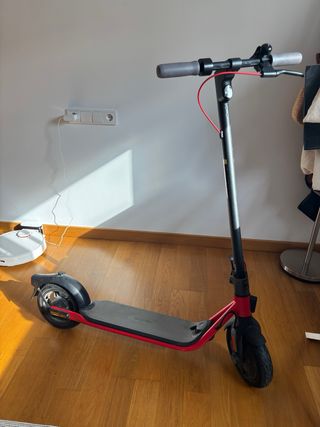 Patinete eléctrico Ninebot con un diseño moderno en rojo y negro. - Manillar con puños grises. - Freno de mano. - Plataforma antideslizante. - Rueda delantera y trasera. Se me le ha roto el cable cargador de la bateria . Precio charlable .