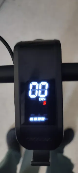 Patinete eléctrico con pantalla digital. - Pantalla con indicador de nivel de batería. - Manillar con acelerador y freno. - Bocina azul.