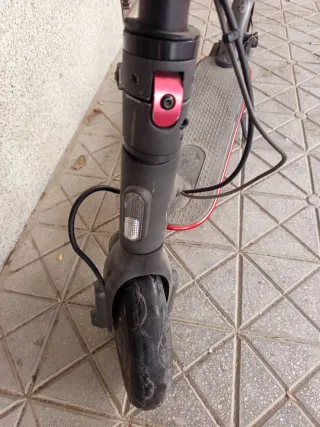 Patinete eléctrico en color negro con detalles en rojo. - Ruedas con aro rojo. - Manillar negro con puños grises. - Incluye luz delantera y trasera. - Suspensión trasera MUY BUENA - Velocidad máxima 30kmh (limitable a 25kmh para circular legal) - Motor potente de 700w - Batería de larga duración 36v 8ah - Display, luz delantera, mástil, batería y claxon nuevos - PVP: 400€ - Único defecto: hay que cambiar la rueda delantera (en un mecánico cuesta aprox 20-25€, en AliExpress cuesta 11€)