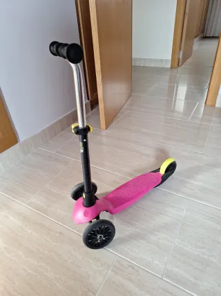 Patinete de tres ruedas de Decathlon en color rosa como nuevo. Uso sólo en casa. - Manillar ajustable en altura. - Ruedas delanteras sin luces. - Plataforma antideslizante. - Plegable.