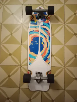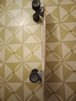 Monopatín en muy buen estado con un diseño geométrico colorido y asa para facilitar su transporte. Precio negociable