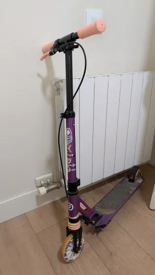 Patinete de la marca Oxelo de Decathlon en color morado. Ideal para desplazamientos urbanos. - Manillar ajustable en altura. - Puños de goma para un mejor agarre. - Ruedas de goma. - Plataforma antideslizante.