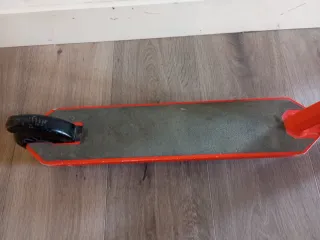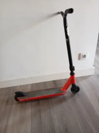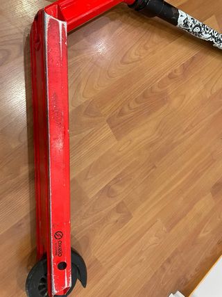 Patinete rojo estilo freestyle, ideal para trucos y maniobras. Está usado, se ve en las fotos. - Diseño deportivo. - Ruedas negras. - Manillar negro con puños.