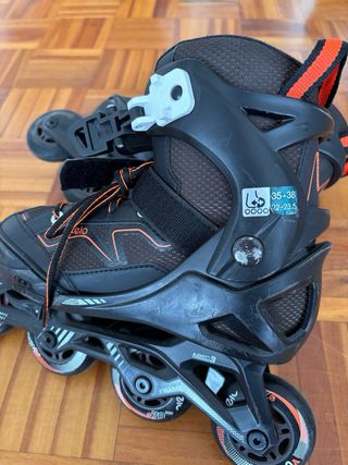 Patines en línea Decathlon ajustables, perfectos para acompañar el crecimiento. - Talla ajustable de 35 a 38. - Diseño en color negro con detalles naranjas. - Cierre de velcro y hebilla para mayor seguridad.
