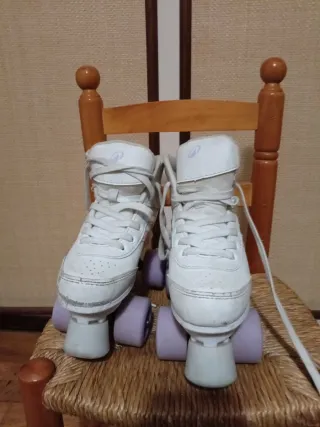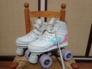 Patines niña altos de Decathlon en color blanco, talla 34. Perfectos para iniciarse en el patinaje. - Diseño moderno con detalles iridiscentes. - Cierre con cordones para un ajuste seguro. - Ruedas resistentes para un deslizamiento suave. Son justitos de talla, mejor para tallas más pequeñas del 34. Mi hija los ha usado muy poquito