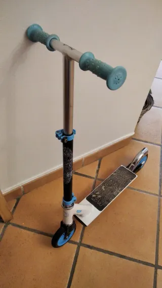 Patinete de la marca Decathlon en color blanco, azul y negro, estructura metálica fuerte. Altura máxima del manillar 77cm.