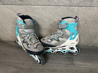 Se venden patines en línea de la marca Decathlon, talla 32- 35. Son de color gris con detalles en azul turquesa y cordones blancos. - Cierre de velcro y hebilla. - Ruedas de 76mm. - Botín interior acolchado.