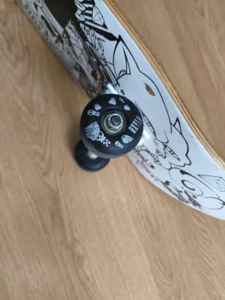 Monopatín de Decathlon con un diseño gráfico llamativo en blanco y negro. Perfecto para desplazamientos urbanos. A pesar de él presentaron dejaste propios del uso están muy buen estado de conservación tal y como se puede ver en las fotos. - Medidas: 79 cm de largo x 20 cm de ancho. - Ruedas negras decoradas y ejes de color blanco.
